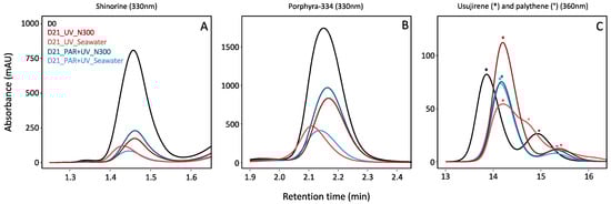 Zoom of HPLC chromatograms obtained from MAAs extracted from Palmaria palmata, after the 1st and the 21st days (i.e., D0 and D21) of cultivation. Colours represent the different light (i.e., PAR or PAR + UV) and nutrient conditions (i.e., NaNO3 at 0 (seawater with no supply), or 300 µM (N300)) (the average of the replicates was used to produce chromatograms). (A) Shinorine at 330 nm; (B) porphyra-334 at 330 nm; (C) usujirene (*) and palythene (°) at 360 nm (the average of the replicates was used to produce the figure, explaining slight shifts in retention times and the overlapping of usujirene and palythene at D21, under UV and without nitrate supply).