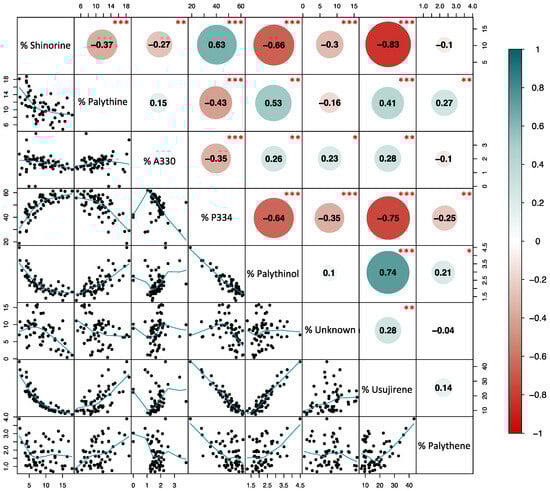 Usujirene and porphyra-334 were the only MAAs exhibiting a significant difference between PAR and PAR + UV (Table S1). Usujirene was the only one that exhibited a slightly higher content under PAR + UV than PAR, with an average of 797.47 ± 245.72 and 614.71 ± 185.44 mAU min mg−1 DW at D21, respectively. Although not significant, palythene, palythinol and the unknown_356 contents also tended to be higher under UV light (Table 1). In particular, the proportion of usujirene was highly positively correlated to palythinol (Kendall’s correlation τ = −0.74, p-value < 0.001; Figure 3). The content of asterina-330 tended also to increase under UV radiations, but only with a high nitrate supply (Student’s test, p-value = 0.010; Table S1, interaction N × L). The opposite pattern was observed for porphyra-334, whose proportions were negatively correlated with the proportion of usujirene and positively correlated to shinorine (Figure 3). With a NaNO3 supply of 100 µM, the porphyra-334 content decreased from 2048.32 ± 536.11 to 1376.54 ± 591.30 mAU min mg−1 DW under PAR and PAR + UV radiation, respectively. Although not significant, shinorine also tended to be higher with PAR light, i.e., 342.23 ± 190.55 compared to 284.96 ± 196.20 mAU min mg−1 DW under PAR + UV radiation.