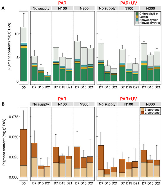 Pigment content (mg g−1 DW), i.e., (A) chlorophyll-a, lutein, r-phycoerythrin and r-phycocyanin, and (B) α-carotene and β-carotene measured in Palmaria palmata during cultivation experiment on 1st, 7th, 15th and 21st days (i.e., D0, D7, D15 and D21), under PAR or PAR + UV light according to three nitrate levels (i.e., NaNO3 at 0 (no supply), 100 (N100) or 300 µM (N300)).