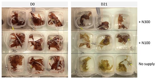 Cultivation tanks of Palmaria palmata at initial date (D0) and after 21 days (D21) of cultivation under PAR light conditions, exposed under three nitrate levels, i.e., NaNO3 at 0 (no supply), 100 (N100) or 300 µM (N300). Note the discolouration of thalli cultivated without N supply at D21.