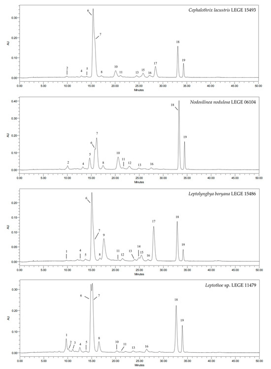 Carotenoid and chlorophyll profiles of acetonic extracts of the cyanobacteria Cephalothrix lacustris LEGE 15493, Nodosilinea nodulosa LEGE 06104, Leptolyngbya boryana LEGE 15486 and Leptothoe sp. LEGE 11479. HPLC-PDA recorded at 450 nm. Chlorophyll-a derivates (1, 2, 3, 8), lutein (4), unidentified carotenoids (5, 9, 10, 11, 12, 14, 16, 17), chlorophyll-a (6), zeaxanthin (7), β-cryptoxanthin (13), echinenone (15), β-carotene (18) and β-carotene derivative (19).