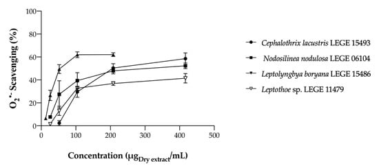 While the acetone extracts revealed weak activities, the aqueous ones were significantly more effective, only reaching IC50 values for O2•− scavenging. The dose-dependent behavior of aqueous cyanobacteria extracts is displayed in Figure 3, while the calculated IC values are presented in Table 3.