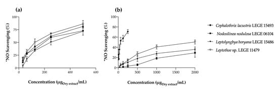 All extracts presented dose-dependent behavior (Figure 4). In general, acetonic extracts were more effective in •NO scavenging than aqueous ones, with all of them reaching IC50 (Table 4). Among the acetonic extracts, that of Leptothoe sp. LEGE 11479 was the most effective, presenting the lowest IC50 value (129.47 μg/mL), being closely followed by Nodosilinea nodulosa LEGE 06104 (186.50 μg/mL) (p > 0.05). The aqueous extract of Cephalothrix lacustris LEGE 15493 seems to be an exception, as it was the one with the best ability to scavenge •NO (IC50 = 36.68 μg/mL) (Table 4).