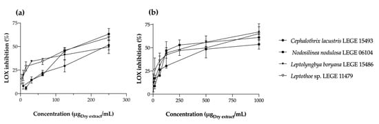 Lipoxygenase (LOX) inhibition by acetonic (a) and aqueous (b) cyanobacteria extracts. The percentage of LOX inhibition is expressed as mean ± SD of at least three independent experiments, performed in duplicate.