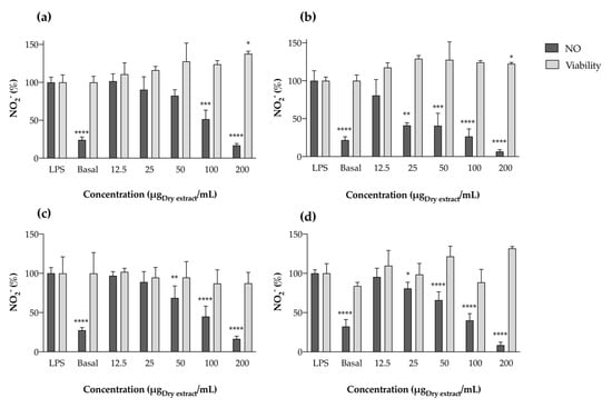 Nitric oxide production by RAW 264.7 cells in the presence of cyanobacteria acetone extracts: Cephalothrix lacustris LEGE 15493 (a), Nodosilinea nodulosa LEGE 06104 (b), Leptolyngbya boryana LEGE 15486 (c), and Leptothoe sp. LEGE 11479 (d), after stimulation with lipopolysaccharide (LPS). Results are expressed as % of nitrite (NO2−) relative to the control stimulated with LPS. “Basal” represents the nitric oxide produced by RAW 264.7 cells without LPS stimulation. Results are expressed as the mean ± SD of at least four independent assays, performed in duplicate. * p < 0.05, ** p < 0.01, *** p < 0.001, **** p < 0.0001 (ANOVA, Tukey HSD).