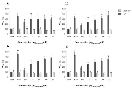 Nitric oxide production by RAW 264.7 cells in the presence of aqueous cyanobacteria extracts: Cephalothrix lacustris LEGE 15493 (a), Nodosilinea nodulosa LEGE 06104 (b), Leptolyngbya boryana LEGE 15486 (c), and Leptothoe sp. LEGE 11479 (d), without lipopolysaccharide (LPS) stimulation. Results are expressed as % of nitrite (NO2−) relative to the basal values produced by untreated cells (Basal). Results are expressed as the mean ± SD of at least four independent assays, performed in duplicate. * p < 0.05, ** p < 0.01 (ANOVA, Tukey HSD).