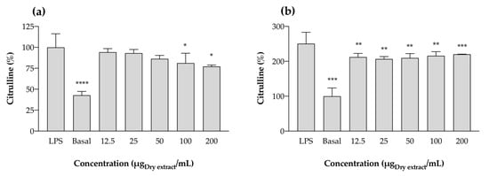 Citrulline production by RAW 264.7 cells in the presence of acetonic (a) and aqueous (b) extracts of Cephalothrix lacustris LEGE 15493. For the acetonic extract (a), results are expressed as % of citrulline relative to the control (Basal) after stimulation with LPS. For the aqueous extract (b), results are expressed as % of citrulline relative to the control (Basal) without LPS stimulation. “Basal” represents the citrulline production by untreated cells without LPS stimulation. Results are expressed as the mean ± SD of at least four independent assays, performed in duplicate. * p < 0.05, ** p < 0.01, *** p < 0.001, **** p < 0.0001 (ANOVA, Tukey HSD).