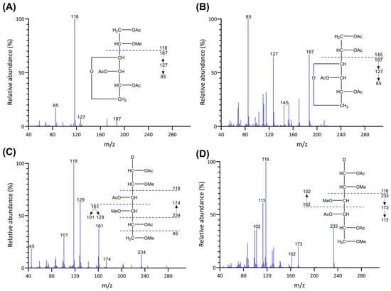 EI-MS spectra and ion fragmentation patterns of PMAAs from (A) 4-AnGalp, (B) 2,4-AnGalp, (C) 3-Galp, and (D) 4-Galp of galactans of Callophyllis sp.