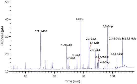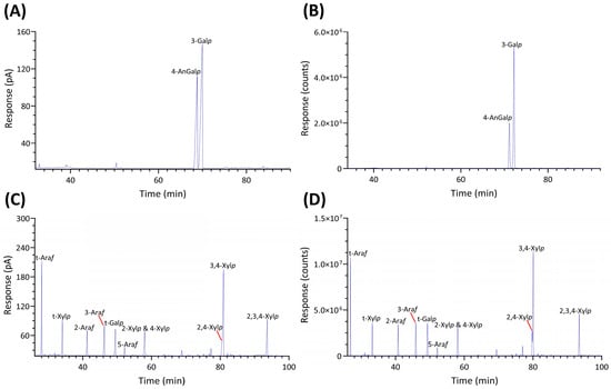 GC-MS/FID-based linkage analysis is a fundamental tool that provides convincing evidence of the types and compositions of monosaccharide linkages present in polysaccharides, oligosaccharides, and biomacromolecules that contain carbohydrate moieties [,,,,,,]. This process involves permethylating the free hydroxyl groups in polysaccharides, followed by hydrolysis to release partially methylated monosaccharides, reduction to C-1 deuterium-labeled alditols via sodium borodeuteride (NaBD4) treatment, then peracetylation to yield partially methylated alditol acetate (PMAA) derivatives for GC-MS/FID analysis [,,]. Conducting linkage analysis on unfractionated cell walls is crucial for understanding the relative compositions of all polysaccharides within the samples, as this approach eliminates the need for fractionation and the potential loss of specific polysaccharides []. The procedure has been frequently used for analysis of unfractionated polysaccharides in the form of alcohol-insoluble residues (AIRs) prepared from higher plants and fungi, whose cell walls mainly consist of neutral monosaccharide, uronic acid, and amino sugar linkages [,,,,,,]. However, the procedure cannot be directly applied to the linkage analysis of unfractionated polysaccharides of red seaweeds due to the presence of sulfated and/or anhydro sugar linkages in galactans. This necessitates special treatments to prevent the under-methylation of sulfated galactans due to their poor solubility in dimethyl sulfoxide (DMSO) in their inorganic salt forms, the loss of methylated sulfated galactans during product cleanup, or the degradation of 3,6-anhydro-galactose during acid hydrolysis [], as detailed in Section 2.1.