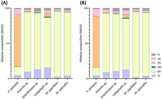 Estimated polysaccharide compositions (Mol%) calculated by summing up compositions of all the linkages, quantified by (A) GC-MS and (B) GC-FID, assigned to each type of polysaccharide of six red seaweed species. UA: unassigned linkages; XN: xylan; MN: mannan; GN: galactan; CE: cellulose; FS: Floridean starch. Two separate experiments were conducted.
