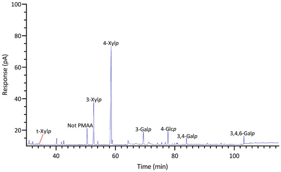 Unlike most red seaweeds, P. palmata, belonging to the order Palmariales, is notable for its rich content of 1,3;1,4-β-d-xylan, making it a targeted species for 1,3;1,4-β-d-xylan extraction []. The AIR of P. palmata was analyzed to reveal compositions of 18% 3-Xylp and 54% 4-Xylp (Table 1, Figure 6). Xylose accounted for 80% of the overall monosaccharide composition (Figure 4, Table S1). The estimated compositions of the AIR included approximately 73% 1,3;1,4-β-d-xylan, followed by 12% galactans, with minor amounts of cellulose and Floridean starch (Figure 5, Table S2), which was in good agreement with a previous report [], indicating that the cell walls of P. palmata were primarily composed of 1,3;1,4-β-d-xylan. Minor levels of 2,4-Xylp and 3,4-Xylp were detected. Notably, a low level of 3,4-Xylp has been previously reported in 1,3;1,4-β-d-xylan extracted from P. palmata []. The identification of 2,4-linked and 3,4-linked xyloses suggested possible branching or substitutions, supported by previous reports that 1,3;1,4-β-d-xylan in P. palmata might form covalent bonds with sulfated and/or phosphorylated xylogalactoproteins [,]. The 4-Xylp to 3-Xylp ratio in 1,3;1,4-β-d-xylan from P. palmata varies from 2 to 4, influenced by extraction methods and harvest season [,,]. A 4-Xylp to 3-Xylp ratio of 3.0 was found for the 1,3;1,4-β-d-xylan of P. palmata (Table 1). Galactose linkages accounted for 12% of all linkages, including minor component of 3,6-anhydro-galactose linkages (Figure 4, Table S1). There has been no report on the detailed structural elucidation of galactan fractions isolated from P. palmata, probably due to their low abundance in the species. A modest presence of 4-Glcp linkages (5%) was noted (Table 1), which was in good agreement with a previous report of 2–7% cellulose content in the cell wall of P. palmata []. Moreover, minimal levels of arabinose and mannose linkages were also observed (Figure 3, Table 1).