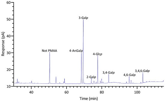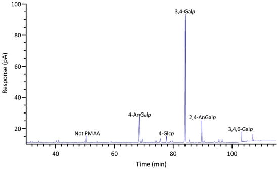 M. papillatus is a seaweed belonging to the Phyllophoraceae family within the Gigartinales order. Seaweeds from the Gigartinales order are known to produce carrageenans []. Gametophytes from the Phyllophoraceae family are recognized for producing ι- or κ/ι-hybrid carrageenans []. The gametophytes of Mastocarpus stellatus were reported to have a carrageenan content of 37% (w/w) dry weight, predominantly from the ‘kappa family’ (κ-, ι-, ν-, μ-carrageenans), with κ- and ι-carrageenans accounting for over 80% of the total carrageenan content []. Mastocarpus pacificus was reported to contain mainly κ/ι-hybrid carrageenans and low levels of their biological precursors, μ- and ν- carrageenans []. As expected, results showed that M. papillatus had the highest levels of 3,6-anhydro-galactose linkages among all examined seaweeds, with 4-AnGalp and 2,4-AnGalp comprising 22% and 12% of the total linkages, respectively, combining to a total AnGalp linkage of 34% (Table 1, Figure 10). The linkage 3,4-Galp, with a high composition level of 46%, represented the highest composition value in Table 1. The significant levels of 3,4-Galp, 4-AnGalp, and 2,4-AnGalp indicated the potential presence of disaccharide unit of 3,4-Galp and 4-AnGalp for κ-carrageenan and a disaccharide unit of 3,4-Galp and 2,4-AnGalp for ι-carrageenan. The higher levels of 4-AnGalp compared to 2,4-AnGalp suggested that the gametophyte produces a higher ratio of κ-carrageenan disaccharide unit than ι-carrageenan disaccharide unit. Additionally, some of the extra 3,4-Galp could link to 4,6-Galp (1%) and 2,4,6-Galp (1%) to form the disaccharide units of µ- and ν-carrageenans, serving as the biological precursors of κ- and ι-carrageenans. Moreover, M. papillatus demonstrated the lowest cellulose composition among all the seaweeds analyzed (Figure 5, Table S2).