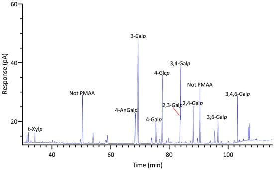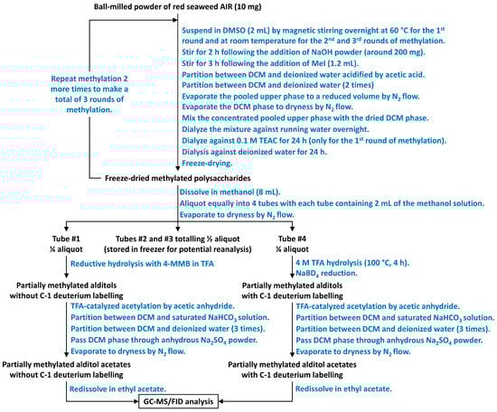 Our methodology did not account for naturally occurring methyl groups in red seaweed polysaccharides; information on methyl groups can be determined through ethylation analysis [] or deuteromethylation analysis [] instead of normal methylation analysis. The quantitation of pyruvate from algal polysaccharides can be conducted by the releasing and subsequent derivatization into its dinitrophenylhydrazone form []. Confirmation of the position of sulfate groups can be achieved by desulfation followed by linkage analysis [,,]. Uronic acid linkages can be determined by reducing the carboxyl group to their corresponding 6,6′-dideuterio neutral sugars before methylation analysis []. The current study did not investigate the uronic acid linkages due to their low natural abundance in red seaweed [].