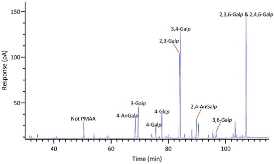 In the current study, various linkages of galactose and anhydrogalactose were detected in each of the red seaweed species. The types and abundances of these galactan-related linkages vary among different species (Table 1, Figure 3). However, linkage analysis is fundamentally an analysis of monosaccharide subunits. It provides information about the positions of hydroxyl groups involved in the formation of glycosidic linkages and sulfate substitution. It cannot provide information on the sequence of linkages (e.g., disaccharide structure) because sequence information is lost when polysaccharide chains are depolymerized into monosaccharides during PMAA preparation. We suggest the use of tandem mass spectrometry or nuclear magnetic resonance-based methods to investigate the disaccharide structure of galactans from these species in future studies [].