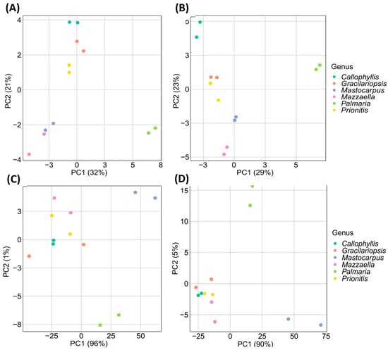 The PCA score plot from GC-FID-derived relative linkage compositions revealed that the first two principal components (PC1 and PC2) accounted for 29% and 23% (totaling 52%) of the total variances (Figure 12A). The PC1 scores visually separated P. palmata from the other five species in the PCA plot, a differentiation likely due to its higher abundance of 3-Xylp and 4-Xylp from 1,3;1,4-β-d-xylan compared to the other analyzed species. Although the other five species could not be well separated based on PC1 scores, the PC2 scores facilitated the visual differentiation of Callophyllis sp., Prionitis sp., and Gracilariopsis sp., while Mastocarpus papillatus and Mazzaella splendens remained unseparated.