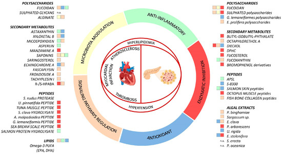 This review summarises the current advancement in the field of marine bioactive compounds for the treatment of two of the main age-related diseases, cardiovascular diseases (CVD) and Type 2 diabetes mellitus (T2DM). These pathologies are closely related since they display common risk factors such as obesity, dyslipidemia, inflammation, and ageing. Moreover, T2DM could predispose to the development of CVD, and patients affected by T2DM develop cardiovascular problems in a higher proportion than normoglycemic people []. The review will consider the potentiality of marine molecules at various stages of the research and approval process, from in vivo pre-clinical studies to more advanced stages, including molecules entered into clinical trials and approved drugs. Finally, common mechanisms of action will be discussed, as well as the challenges to face in accelerating the translation process towards clinical application.