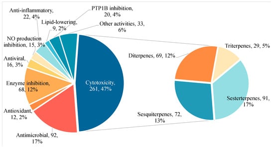 During the last fifteen years, it has been seen that sponge-associated terpenes have diverse chemical structures and a wide variety of biological activities (antimicrobial, antitumor, antioxidant, anti-inflammatory, antiviral, antimalarial, antitubercular, anti-aging, antifouling, and antiprotozoal) [,,]. Previous reviews have only generalized to a particular class of sponges, or a particular class of terpenes, such as nitrogen-containing or triterpenes, and have covered a short period of time [,,]; hence, the need for a comprehensive review that encompasses a substantial amount of data. This review collects all the related literature from January 2009 to December 2024 and completely describes the new sponge-associated terpenes from 249 articles. Figure 1 illustrates the percentage of different activities of new compounds discovered from January 2009 to December 2024. It is evident that cytotoxicity represents the biological activity with the most substantial proportion. Among the four primary terpenes contributing to this activity, sesterterpenes hold the largest share, followed by sesquiterpenes and diterpenes.