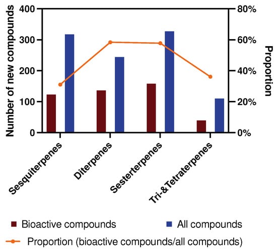 The number and proportion of new bioactive compounds in different terpenes for 2009–2024.