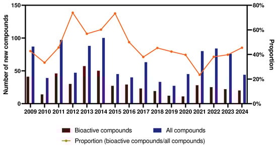 Trends in the number and proportion of new bioactive compounds for 2009–2024.