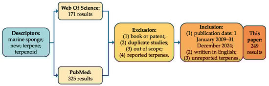 The data collection for this research was conducted using the major online databases Web of Science and PubMed, employing the following descriptors: marine sponge, new terpene and terpene, and new terpenoid and terpenoid. The inclusion criteria were as follows: (1) a publication date from 1 January 2009 to 31 December 2024; (2) written in English; (3) terpenes were first found in the article. Initially, 496 results were identified (325 from PubMed and 171 from Web of Science). The exclusion criteria included the following: (1) book chapters and patents; (2) duplicate studies; (3) studies that were not within the scope; (4) terpenes that were not new. As a result of this survey, the articles included in this systematic review comprise 249 publications and 997 compounds (Figure 4).