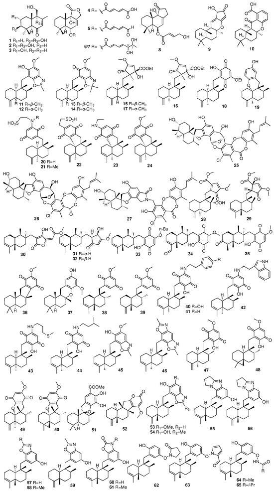 Ebada and coworkers investigated a MeOH extract of the Indonesian marine sponge Dactylospongia elegans, afforded two undescribed drimane meroterpenoidal metabolites named dactylospongenones G and H (28–29) []. Yu and colleagues isolated ten sesquiterpenes (30–39) of different types from the sponge Pseudoceratina purpurea []. Pseudoceranoid D (33) showed weak cytotoxicity against the K562, H69AR, and MDAMB-231 cell lines with IC50 values of 3.01, 7.74, and 9.82 μM, respectively. Pseudoceranoid E (34) exhibited cytotoxicity against the H69AR cell line with an IC50 value of 2.85 μM. Daletos et al. had reported five new sesquiterpene aminoquinones (40–44) and two new sesquiterpene benzoxazoles (45–46) from the sponge Dactylospongia metachromia collected from Ambon, Indonesia []. Moreover, compounds 40–44 showed potent cytotoxicity against the mouse lymphoma cell line L5178Y with IC50 values ranging from 1.1 to 3.7 μM, and compounds 46 and 46 exhibited the strongest inhibitory activities against the ALK, FAK, IGF1-R, SRC, VEGF-R2, Aurora-B, and MET wt cell lines and NEK6 kinases (IC50 = 0.97–8.62 μM). Compounds 47–51 were isolated from the sponge Dactylospongia elegans collected in Palau and Malaysia []. The compounds 47 and 48 were found to activate HIF-1 and stimulate the expression of the HIF-1 target gene vascular endothelial growth factor (VEGF) in both T47D and PC-3 cells. Compounds 52–54 were isolated and characterized from the Hyrtios sp. collected from the South China Sea []. Hyrtiolacton A (52) is the first example of a pyrone-containing 4,9-friedodrimane-type sesquiterpene. Nakijinol G (54) showed PTP1B inhibitory activity with IC50 values of 4.8 μM. Eleven new nitrogenous meroterpenoids (55–65) were isolated from the marine sponge Dysidea cinerea collected in the South China Sea []. Compounds 55–57 and 60 exhibited moderate inhibitory activities against PTP1B, ATP-citrate lyase, and SH2 domain-containing phosphatase-1 with IC50 values of 2.8–27 μM.