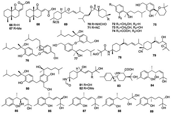 An investigation of a Formosan sponge Axinyssa sp. collected from coral reefs off the coast of Pingtung in Taiwan, China, has led to the isolation of two nitrogenous bisabolene-type sesquiterpenes (79–80) []. Compound 79 exhibited moderate-to-weak cytotoxicity against the Molt4 and K562 cancer cell lines with IC50 values of 14.3 and 4.7 μg/mL, respectively. In 2016, a chemical investigation of the marine sponge Axinyssa variabilis yielded two new highly oxidized formamide bisabolene sesquiterpenes (81–82) []. A new rearranged nitrogenous bisabolene-type sesquiterpene, halichonic acid B (83), was obtained from the marine sponge Axinyssa sp. collected from the same place []. Wang and colleagues isolated six new bisabolane-type phenolic sesquiterpenoids, including plakordiols A-D (84–87), (7R, 10R)-hydroxycurcudiol (88), and (7R, 10S)-hydroxycurcudiol (89) from the marine sponge Plakortis simplex collected from the South China Sea []. Compound 88 inhibited bone morphogenic protein (BMP)-induced alkaline phosphatase activity in mutant BMP receptor-carrying C2C12 cells with IC50 values of 51 μM. The chemical structures of compounds 66–89 are depicted in Figure 6.