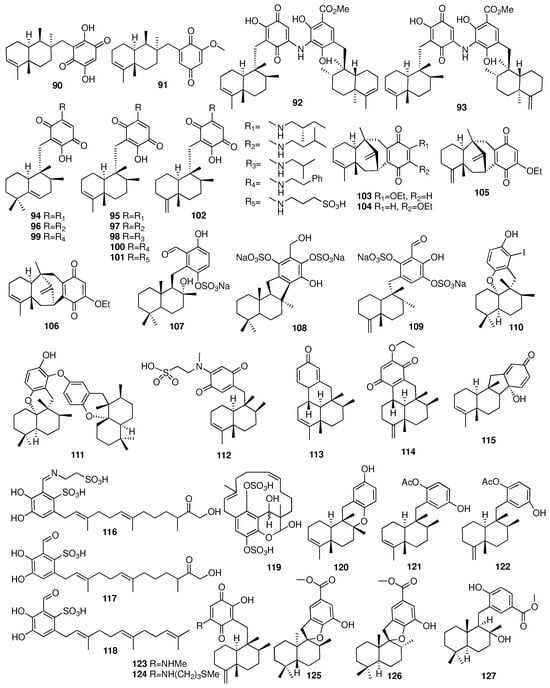 An investigation of the marine sponge Dysidea avara afforded a new sesquiterpene (-)-N-methylmelemeleone-A (112) []. Compound 112 showed very weak cytotoxic activity on human colon carcinoma cells, mouse lymphoma cells, and rat hepatoma cells. Compounds 113–115 were isolated with unprecedented carbon skeletons from the South China Sea sponge Dysidea avara []. Dysideanone B (114) showed cytotoxicity against the HeLa and HepG2 cell lines with IC50 values of 7.1 and 9.4 μM, respectively. Furthermore, compound 114 exhibited significant inhibitory effects on the nitric oxide production induced by lipopolysaccharide at 10 μM. Compounds 116–119 were isolated from the Caribbean sponge Aka coralliphagum collected off the coast of San Salvador in the Bahamas []. Compound 118 exhibited weak activity against the Gram-positive bacteria Staphylococcus aureus and Micrococcus luteus, and compound 119 showed cytotoxic activities against the L929 mouse fibroblasts, KB-31 epidermoid carcinoma, and breast cancer cell line MCF7. Three new sesquiterpene hydroquinones (120–122) were isolated from the marine sponge Dysidea sp. collected from Okinawa []. Compounds 120–122 had PTP1B inhibitory activities with IC50 values of 11, 9.5, and 6.5 μM, respectively. Two new sesquiterpene aminoquinones (123–124) were acquired from the sponge Spongia sp., which was collected in Vietnam []. Compounds 123 and 124 exhibited remarkable antibacterial activities against Staphylococcus aureus and Bacillus subtilis with MIC values ranging from 6.25 to 12.5 μM. In contrast, they were inactive against Klebsiella pneumoniae and Escherichia coli. The chemical structures of compounds 90–127 are depicted in Figure 7.