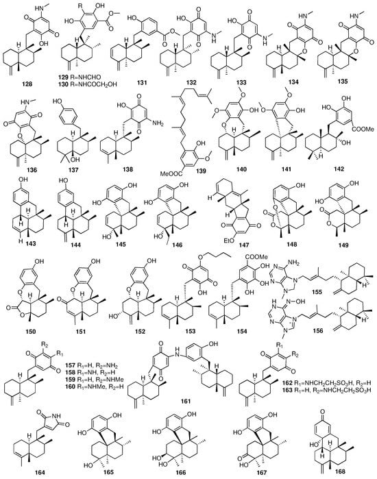 Takahashi et al. reported two novel merosesquiterpenoids (153–154) from different sponges identified as Spongiidae sp. []. Lastly, compounds 153 and 154 exhibited antimicrobial activities against Escherichia coli, Staphylococcus aureus, Bacillus subtilis, Micrococcus luteus, Aspergillus niger, Trichophyton mentagrophytes, Candida albicans, and Cryptococcus neoformans. In 2010, a chemical investigation of the sponge Agelas nakamurai collected from Menjangan Island in Indonesia afforded two new diterpenes (155–156), containing the adenine-related moiety []. Compound 155 showed antibacterial activity against the planktonic form of S. epidermidis (MIC < 0.0877 μM) but did not inhibit biofilm formation. On the contrary, compound 156 showed biofilm formation inhibition but did not inhibit the growth of the planktonic bacteria. Utkina et al. isolated four new sesquiterpenoid arenarone derivatives (157–160) and a novel dimeric popolohuanone F (161) from the CHCl3 extract of the Australian marine sponge Dysidea sp. []. Compound 161 showed 2,2-diphenyl-1-picrylhydrazyl (DPPH) radical scavenging activity with an IC50 value of 19 μM. Two new sesquiterpenoids (162–163) were obtained from a culture broth of the seawater-derived fungus Trichoderma sp. TPU1237 isolated from the marine sponge Dysidea sp. []. The IC50 values of compounds 162 and 163 against PTP1B were 53.1 and 65.1 μM, respectively. A few months later, they reported another merosesquiterpenoid (164) from another marine sponge Dysidea sp. []. Its absolute configuration was established by single-crystal X-ray diffraction analysis. Additionally, dysidinoid A (164) showed potent antibacterial activity against one strain of pathogenic bacteria, methicillin-resistant Staphylococcus aureus (MRSA), with an MIC90 value of 8.0 μg/mL. Four new tetracyclic meroterpenes (165–168) were isolated from an organic extract of the Dysidea sp. collected from the Xisha Islands []. The chemical structures of compounds 128–168 are depicted in Figure 8.