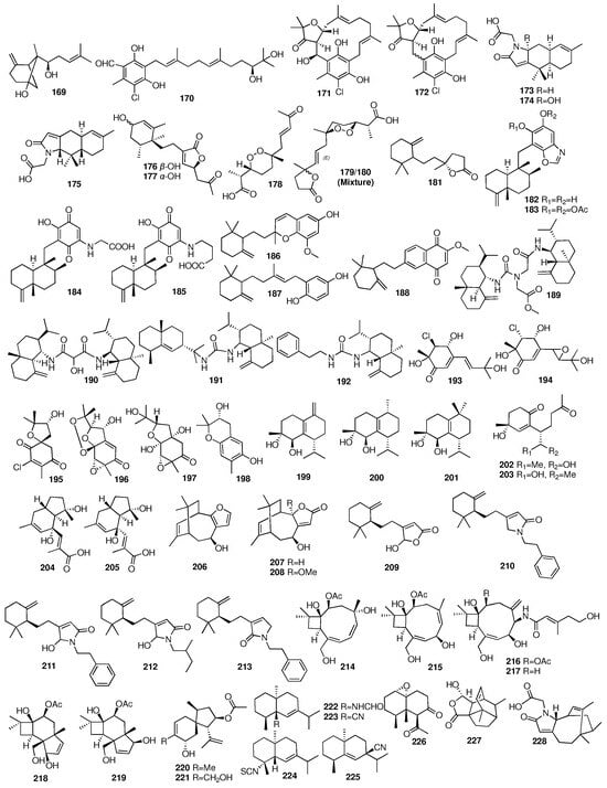Researchers from the Tohoku Pharmaceutical University obtained three new unique sesquiterpenes (206–208) from the marine sponge Euryspongia sp. collected from Iriomote Island in Japan [], and the absolute configuration of 206 was determined after two years []. Compounds 209–213 were isolated from crude extracts of the marine sponge Ircinia sp. []. Two terpenoids (209, 212) showed PPARδ agonistic activities with EC50 values of 18 and 30 μg/mL, respectively. Wu et al. reported six new caryophyllene-based sesquiterpenoids (214–219) from the fungus Hansfordia sinuosae isolated from the South China Sea sponge Niphates sp. []. All the compounds showed weak cytotoxic activity against HCT-8, Bel7402, BGC823, A549, and A2780 with IC50 values of more than 10 μM. These compounds also showed weak inhibitory effects against the bacterial strains of Escherichia coli, Staphylococcus aureus, Bacillus thuringensis, and Bacillus subtilis with MIC values of more than 125 μM. In addition, punctaporonin K (217) exhibited potent effects to reduce the triglycerides and total cholesterol at the intracellular level. Compounds 220–221 were isolated from a rice solid culture medium of the fungus Penicillium adametzioides AS-53 obtained from an undescribed sponge collected from Hainan Island in the South China Sea []. Compound 221 showed selective activity against the NCI-H446 cell line with an IC50 value of 5.0 μM. An investigation into the Hainan sponge Axinyssa variabilis yielded four new uncommon nitrogenous eudesmane-type sesquiterpenes (222–225) []. Compound 226 was isolated from the sponge Carteriospongia foliascens collected from the South China Sea []. The chemical structures of compounds 169–228 are depicted in Figure 9.