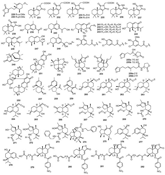 Liang and colleagues in Jinan University isolated a pair of new valerenane sesquiterpene enantiomers (253–254) from the marine sponge Spongia sp. []. In 2018, researchers from the Shanghai Institute of Materia Medica had reported two rare new furano-trinorsesquiterpenoids (255–256), which were isolated from the n-BuOH portion of the Beihai sponge Spongia officinalis []. Further separation led to their corresponding enantiomers. All the new compounds were found to exhibit inhibitory activity against LasR and functioned as Pseudomonas aeruginosa QS inhibitors. Three new spiro-sesquiterpenoids, myrmekiones A–C (257–259), were isolated from the marine sponge Myrmekioderma sp. collected from the South China Sea []. Shen and coworkers conducted a detailed chemical investigation of the South China Sea nudibranch Hexabranchus sanguineus, as well as its possible prey the sponge Acanthella cavernosa, leading to the isolation of fifteen new nitrogenous sesquiterpenoids, namely, ximaocavernosins A–O, including seven cadinanes (260–266), seven spiroaxanes (267–273), and one aromadendrane (274) []. The same year, they isolated one new aromadendrane-type sesquiterpenoid (275) and three new cadinane-type sesquiterpenoids (276–278) from the Hainan sponge Acanthella cavernosa, namely, ximaocavernosin P, (+)-maninsigin D, (+)- and (−)-ximaocavernosin Q []. Four new nitrobenzoyl sesquiterpenoids, insulicolides D–G (279–282), were identified from Antarctican sponge-derived Aspergillus insulicola HDN151418. Further studies indicated that insulicolide D (279) could significantly suppress cell proliferation to induce apoptosis and blocked the migration and invasion of the pancreatic ductal adenocarcinoma (PDAC) cell lines with IC50 values of 2.3–22.9 μM [,]. The chemical structures of compounds 229–282 are depicted in Figure 10.