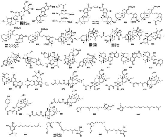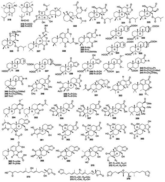 Spongian diterpenes are an important class of diterpenoid products. Compounds 321–322 were isolated from an unidentified sponge collected along the coast of Okinawa []. They exhibited significant cytotoxicty against NBT-T2 rat bladder epithelial cells with IC50 values of 5.6 and 12 μg/mL, respectively. In 2016, four additional new cytotoxic spongian diterpenes (323–326) were isolated from the acetone extract of Dysidea cf. Arenaria []. The cytotoxicity to NBT-T2 cells was examined, and they displayed IC50 values of 3.1, 1.9, 8.4, and 3.1 μM, respectively. Darwinolide (327) was isolated from the Antarctic dendroceratid sponge Dendrilla membranosa []. Darwinolide was cytotoxic against the biofilm phase of the methicillin-resistant S. aureus strain and J774 macrophage cell line with IC50 values of 33.2 and 73.4 μM. Moreover, it may provide a scaffold for the development of therapeutics for this difficult-to-treat infection. In 2017, an investigation of the sponge Darwinella cf. oxeata collected in Brazil afforded four new rearranged spongian diterpenoids (328–331) []. A chemical investigation of the Indonesian marine sponge Spongia ceylonensis had provided sixteen new spongian diterpene derivatives (332–347) [,,]. The inhibitory effects on the RANKL-induced osteoclasts in RAW264 macrophages revealed that ceylonin A (332) significantly inhibited the formation of multinuclear osteoclasts by 70% in a dose-dependent manner without cytotoxicity, followed by ceylonins E (336, 47%), F (337, 31%), and D (338, 28%).