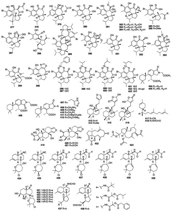 Two new nitrogenous prenylbisabolanes (417–418) were isolated from the hexane and acetone extracts of the marine Lithistid sponge Theonella swinhoei, which was obtained from the coral reef of Iriomote Island in Japan []. Compounds 419–421 were isolated from an EtOAc extract of the marine sponge Spongia officinalis collected from the South China Sea []. In addition, all the compounds exhibited moderate inhibition against LPS-induced NO production in RAW264.7 macrophages with IC50 values of 12-32 μM. Another chemical study on the marine sponge Fascaplysinopsis reticulata has led to the isolation of a new dolabellane-type diterpenoid (422) []. Luo et al. isolated another new dolabellane diterpene, 6,10,18-triacetoxy-2E,7E-dolabelladiene (423), from the South China Sea sponge Luffariella variabilis []. It demonstrated cytotoxicity towards MCF-7 with an IC50 value of 79.2 μM. Wang and colleagues purified seven new kalihinane diterpenoids, kalihioxepanes A-G (424–430), from the sponge A. cavernosa collected in the South China Sea. Kalihioxepane A (424) displayed strong cytotoxicity against H69 and K562 tumor cells, while kalihioxepane B (425) showed moderate cytotoxicity against K562 cells []. Wang and colleagues isolated eight unreported α-acyloxy amides substituted kalihinane diterpenes, named kalihiacyloxyamides A–H (431–438), from the South China Sea sponge Acanthella cavernosa []. Compounds 433 and 435 exhibited cytotoxicity against the K562 cell line with IC50 values of 6.4 and 6.3 μM, respectively. The IC50 values of compounds 435 and 438 against the MDA-MB-231 cell line were 7.3 and 7.9 μM, respectively. The chemical structures of compounds 377–438 are depicted in Figure 13.