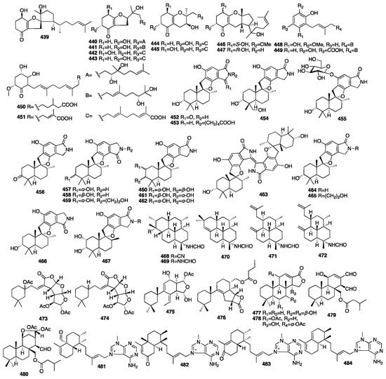 In 2009, five new diterpene formamides (468–472) were reported from the tropical marine sponge Cymbastela hooperi []. In an in vitro antiplasmodial experiment, compound 468 was found to have moderate activity (IC50 = 0.5 μg/mL) and compound 469 had weak activity (IC50 = 14.8 μg/mL), but 470–472 were inactive. Moreover, compound 468 was the rarely natural product that contained both formamide and isonitrile functionalities within the same molecule. Compounds 473–476 were isolated from the marine sponge Spongionella sp. []. All the compounds showed cytotoxic activity against K562 human chronic myelogenous leukemia cells, with IC50 values ranging from 4.5 to 15 μM. Meanwhile, they showed slightly toxicity toward the normal PBMC cells, with IC50 values ranging from 6.5 to 30 μM. Moreover, all the compounds were proved to be active at a concentration of 100 μM, with gracillin L (475) being the most potent (with an inhibition rate = 75%) towards the protein tyrosine kinase EGF-R, and, similarly, as active as the positive control, genistein, which showed an 80% inhibition. Four new spongian-class diterpenes (477–480) were isolated from the sponge Dysidea cf. arenaria collected in Okinawa []. All the compounds showed cytotoxicity against NBT-T2 rat bladder epithelial cells with IC50 values of 10, 1.9, >10, and >10 μg/mL. Four novel 9-N-methyladeninium diterpenoids (481–484) were isolated from the marine sponge Agelas sp. collected in Papua New Guinea []. These compounds represented higher unsaturated 9-N-methyladeninium bicyclic diterpenoid derivatives. All the isolated compounds were evaluated for inhibitory activity against Trypanosoma brucei, as well as for cytotoxicity against Jurkat cells. Compounds 482 and 483 displayed significant inhibitory action against T. brucei with IC50 values of 3.6 and 3.0 μg/mL. Moreover, compounds 481–483 showed cytotoxicity against Jurkat cells with IC50 values of 8.4, 3.3, and 25.0 μg/mL. The chemical structures of compounds 439–484 are depicted in Figure 14.