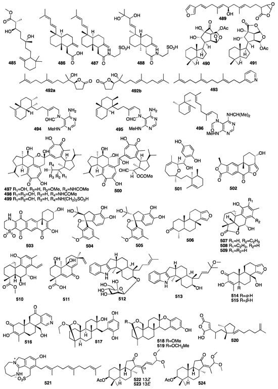 In 2010, a study on the marine sponge Negombata corticata, a norterpene-related peroxide (485) was also identified from its EtOH extract []. Three new unusual C21 terpenoids (486–488) were isolated from a MeOH extract of the marine sponge Clathria compressa collected from Panama City in Florida []. Clathric acid (486) showed an MIC value of 32 μg/mL against Staphylococcus aureus (ATTC 6538P) and 64 μg/mL against both methicillin-resistant (ATTC 33591) and vancomycin-resistant Staphylococcus aureus (VRSA). One new oxygenated terpenoid (489) was isolated from the marine sponge Coscinoderma matthewsi collected from the Inner Gneerings Reef, Southeast Queensland, and another two (490–491) were isolated from another sponge Dysidea sp. collected from the same place []. A chemical investigation of a MeOH extract of the South China Sea sponge Cacospongia sp. yielded two terpenoids belonging to two different skeleton types, including the unusual C17 γ-lactone norditerpenoids (492) and the rare C21 pyridine meroterpenoid (493) []. In 2013, an investigation of the marine sponge Agelas axifera led to the isolation of three new pyrimidine diterpenes (494–496) []. All the compounds were found to be moderate inhibitors to cancer cell growth, such as the P388, BXPC-3, MCF-7, SF-268, NCI-H460, KML20L2, and DU-145 cell lines. In addition, axistatins 1–3 (494–496) had identical antimicrobial profiles, inhibiting Gram-positive bacteria, the exquisitely sensitive Gram-negative pathogen Neisseria gonorrheae, and the opportunistic fungus Cryptococcus neoformans.
