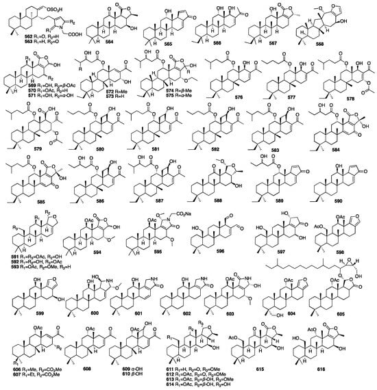 Sesterterpenes are rare in terrestrial plants and are mainly found in sponges and their associated microorganisms, such as coscinolactams A and B (562–563), two novel nitrogen-containing cheilanthane sesterterpenoids, isolated from the marine sponge Coscinoderma mathewsi []. In addition, these two compounds showed moderate anti-inflammatory activity, measured as their capability to inhibit PGE2 and NO production. Sesterterpenes have three main structural types: manoalide-type, hyrtiosane-type, and scalarane-type. Of these, the scalarane-type is the most common []. A bioassay-guided separation led to the isolation of three new scalarane sesterterpenes (564–566) from the acetone extract of the South China Sea sponge Phyllospongia foliascens []. Moreover, compound 565 showed cytotoxic activity against the P388 leukemia cell line with an IC50 value of 6.5 μg/mL. One year later, the same authors reported an additional new scalarane sesterterpene (567) from the same sponge []. A chemical investigation of an EtOAc-soluble fraction of the methanolic extract of the Thai sponge Hyrtios gumminae led to the isolation of four new sesterterpenes (568–571) []. Compounds 572–575 were isolated from the Indonesian marine sponge Carteriospongia foliascens, which was harvested near Makassar, Indonesia []. Compound 572 had moderate inhibition of RCE-Protease with an IC50 value of 38 μg/mL. Furthermore, the cytotoxic effect of 572 against four cell lines (PC-3, LoVo, CACO-2, and MDA-468) was more active than 573 with IC50 values of less than 10.0 μg/mL. In a parallel study on the marine sponge Carteriospongia foliascens, 15 novel sesterterpenes (576–590) were identified from its organic extract []. In addition, compound 579 showed remarkable antifouling activity against barnacle Balanus amphitrite and lethal activity against A. salina with EC50 values less than 2.5 μg/mL, LD50 values between 4.0 and 10.0 μg/mL. Compounds 591–595 were isolated from the sponge Hyatella sp., collected off the coast of Soheuksan-do in Korea []. These compounds exhibited moderate cytotoxicity and antibacterial activity and weak inhibitory activity against isocitrate lyase.