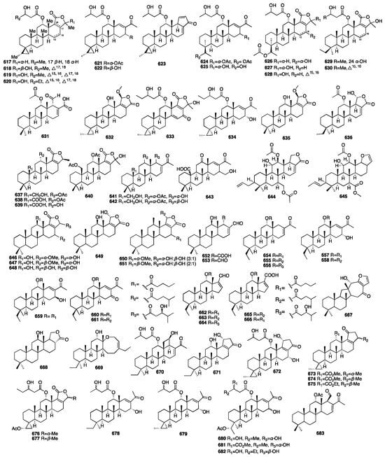 Three novel scalarane sesterterpenes (596–598) were isolated from a Korean marine sponge Psammocinia sp. Furthermore, they exhibited cytotoxicity against the intractable human cancer cell lines A498, ACHN, MIA-paca, and PANC-1, with IC50 values ranging from 0.4 to 48 μM []. In 2014, five new scalarane derivatives (599–603) were isolated from the organic extract of two Thorectidae sponge samples, Hyrtios sp. and Petrosaspongia sp., collected from the Fiji Islands []. Furthermore, these molecules were tested by AlphaScreen at several concentrations from 50 pM to 50 μM to deeply explore their inhibition profile. The results showed activities for compounds 600 and 601 with IC50 values of 0.6 μM and 0.4 nM. Compound 600 was also the most potent compound in reducing the binding of TDP-43 to its cognate DNA. Compounds 604–605 were isolated from a MeOH extract of the South China marine sponge Hyrtios erectus []. In 2015, a biology-guided fractionation of the Cl2H2 fraction of the marine sponge Phyllospongia lamellose collected from Shaab Saad, 13 km north of Hurghada, along the Red Sea, yielded five new scalarane-type sesterterpenes (606–610) []. All the compounds had different inhibitory activities against three cancer cell lines (MCF-7, HCT-116, and HePG-2) at the highest concentration of 10 μg/mL when compared to doxorubicin. Compound 610 showed the strongest inhibitory activity against Gram-positive strains. Peng and colleagues isolated six new 24-homoscalaranes, lendenfeldaranes E-J (611–616), from the marine sponge Lendenfeldia sp. []. Compounds 611–613 were proven to be the first anti-neutrophilic scalaranes.