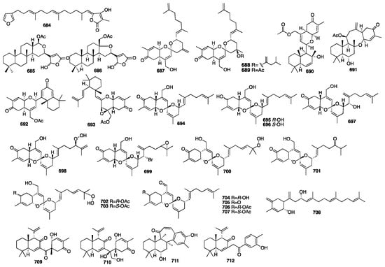 Compounds 684–686 were obtained from the New Zealand marine sponge Semitaspongia bactriana with toxicity against the diatom Nitzschia closterium and bryozoan Bugula neritina []. Furthermore, all three compounds exhibited toxicity against B. neritina with EC50 values of 7.41, 1.22, and 1.59 μM, respectively. Studies on the organic extract of the marine sponge Hamigera sp. offered two new sesterterpenoids (687–688) []. Alotaketals A (687) and B (688) have an unprecedented alotane carbon skeleton, and they significantly activate the cAMP cell signaling pathway with EC50 values of 18 and 240 nM, respectively. One year later, ansellone A (689) was isolated from the sponge Phorbas sp. []. It was a new sesterterpenoid with the unprecedented “ansellane” carbon skeleton, and it also activated the cAMP signaling in HEK293 cells in the absence of hormone binding with an EC50 value of 14 μM. Later, four new sesterterpenoids (690–693) were isolated from specimens of the sponge Phorbas sp. collected in British Columbia []. Alotaketal C (693) activated cAMP signaling in HEK293 cells with an EC50 value of 6.5 μM. Compounds 694–696, with a spiroketal of the hydrobenzoyran moiety, were isolated from the Korean marine sponge Phorbas sp. []. Phorbaketal A (694) exhibited mild activity against human colorectal cancer HT-29 with an IC50 value of 12 μg/mL, hepatoma cancer HepG2 with an IC50 value of 11.2 μg/mL, and lung cancer A549 with an IC50 value of 11 μg/mL. Further investigation of the marine sponge of the genus Phorbas collected from Gageo Island, Korea, reported three additional sesterterpenoids named phorbaketals L–N (697–699) []. The cytotoxicity of compounds 697–699 was evaluated against three human cancer cell lines using the MTT assay. The results showed that compound 699 exhibited potent activity against the human pancreatic cancer cell line Panc-1 and the renal cancer cell lines A498 and ACHN with IC50 values of 11.4 μM, 18.7, and 24.4 μM, respectively. An additional nine new sesterterpenoids (700–708) were isolated from another Korean sponge Monanchora sp. []. The absolute configurations of these compounds were defined using the modified Mosher’s method and a CD spectroscopic data analysis. Compounds 704 and 705 showed weak cytotoxicity against the A498 human renal cancer cell line. Compound 708 showed moderate activity against all four human cancer cell lines, while the others were inactive. University of Auckland researchers achieved a total synthesis of 708 in 2015 []. Later, two new sesterterpenoids (709–710) were isolated from the Korean marine sponge Phorbas sp. []. The absolute stereochemistry of compound 709 was determined by the Mosher ester method and exhibited a positive effect on the calcium deposition activity in C3H10T1/2 cells. The same group at Seoul National University reported two unprecedented sesterterpenoids, phorone A (711) and isophorbasone A (712), which were isolated from Korean marine sponge Phorbas sp. []. The chemical structures of compounds 684–712 are depicted in Figure 19.