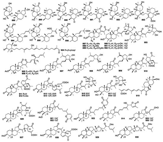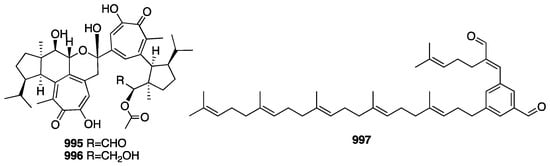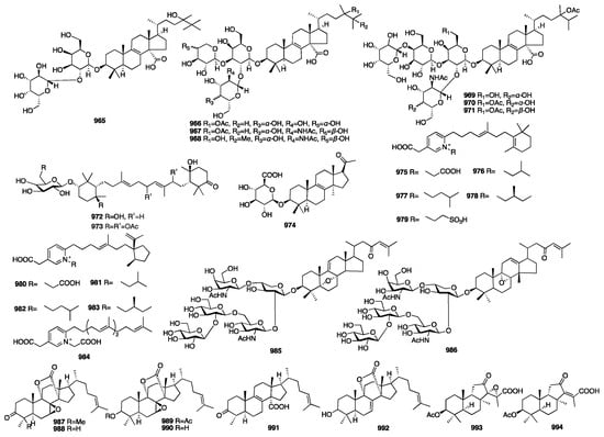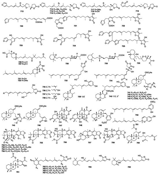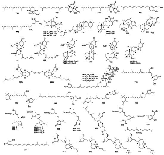 In 2016, eight new sesterterpenoids (781–788) were isolated from a MeOH extract of the marine sponge Phorbas sp. collected in Howe Sound, British Columbia []. Compounds 781 and 787 were found to induce HIV proviral gene expression. In the next year, a pair of enantiomeric sesterterpenoids (789) were isolated from the EtOH extract of the marine sponge Hippospongia lachne collected from South China Sea []. Compounds 789a and 789b showed potent antifungal activity against three strains of hospital-acquired pathogenic fungi, Candida albicans SC5314, Candida glabrata 537, and Trichophyton rubrum, with MIC50 values between 0.125 and 0.25 μg/mL. A chemical investigation of the Mediterranean Homoscleromorpha sponge Oscarella balibaloi isolated and identified a new family of simple glucosylated sesterterpenes (790–793), named balibalosides []. In a study of the sponge Cacospongia sp., additional skeleton types, C25 manoalide-type sesterterpenoids (794–796), were isolated []. Oshimalides A (797) and B (798) were isolated from the Luffariella sp. marine sponge []. Luo and coworkers isolated eleven rare acyclic manoalide derivatives (799–810) from the sponge Luffariella variabilis collected in the South China Sea. Compounds 799–805 and 809 demonstrated cytotoxic activity against several human cancer cell lines with IC50 values ranging from 2 to 10 μM []. Yu and colleagues isolated five new γ-oxygenated butenolide sesterterpene derivatives, dactylospenes A–E (811–815). Compounds 811 and 813 exhibited moderate cytotoxicity against the DU145, SW1990, Huh7, and PANC-1 cancer cell lines with IC50 values in the range of 2.11–13.35 μM []. The chemical structures of compounds 768–815 are depicted in Figure 21.