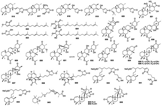 Three new natural marine compounds, isosuberitenone B (835), 19-episuberitenone B (836), and isooxaspirosuberitenone (837), were isolated from the Antarctic sponge Phorbas areolatus []. Compounds 835–837 represented new chemical entities of suberitane sesterterpenoids. These compounds were found to exhibit moderate cytotoxic activity, whereas 835 and 836 displayed significant activity against the A549, HepG2, HT-29, and MCF-7 cell lines with IC50 values of less than 10 μM. Majer and coworkers isolated two new ircinianin-type sesterterpenoids, ircinianin lactone B (838) and ircinianin lactone C (839), from the marine sponge Ircinia wistarii. Ircinianin lactones B and C represented new ircinianin terpenoids with a modified oxidation pattern []. Compounds 840–842 were isolated from an organic extract of the marine sponge Fasciospongia sp. collected in Palau []. These compounds exhibited inhibitory activity against Streptomyces 85E in the hyphae formation inhibition assay. Only compound 842 demonstrated a moderate cytotoxic effect on MCF-7 (IC50 = 13.4 μM), LNCaP (IC50 = 21.8 μM), and LU-1 cells (IC50 = 5.0 μM), respectively. A study on the marine sponge Negombata corticata, a norterpene-related peroxide (843), was identified from its EtOH extract []. Compounds 844–846 were obtained from the EtOAc extract of the marine-derived fungus Aspergillus insuetus, which was isolated from the Mediterranean sponge Psammocinia sp. []. Compound 844 exhibited weak anti-fungal activity towards N. crassa with an MIC value of 140 μM. Meanwhile, compound 846 showed mild cytotoxicity towards MOLT-4 human leukemia cells. The chemical structures of compounds 816–846 are depicted in Figure 22.