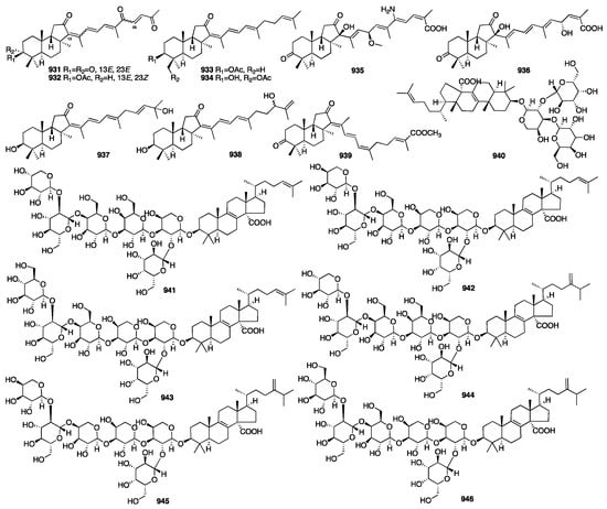 - Stonik, V.A.; Kolesnikova, S.A. Malabaricane and Isomalabaricane Triterpenoids, Including Their Glycoconjugated Forms. Mar. Drugs 2021, 19, 327. [Google Scholar] [CrossRef] [PubMed]