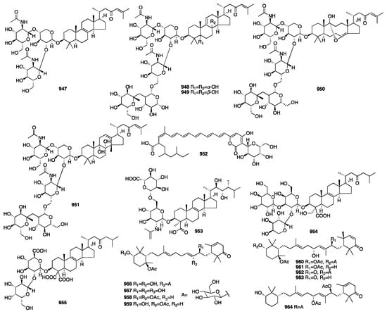 - Mama, R.L.; Gelani, C.D.; Daluz, J.M.T.; Uy, M.M.; Ohta, E.; Ohta, S. Two New Sarasinosides from Marine Sponge Petrosia nigricans. Nat. Prod. Res. 2024, 38, 2395–2403. [Google Scholar] [CrossRef] [PubMed]