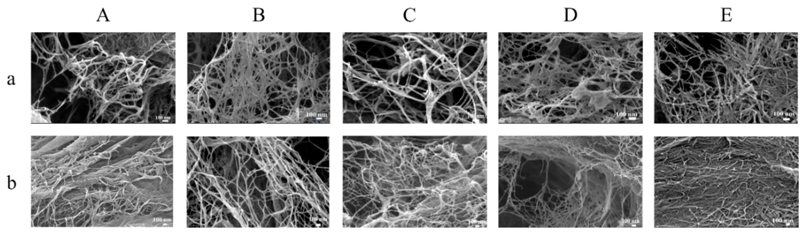 2.7. Effect of Homogenization Pressure on Microstructure of Cellulose Nanofibers