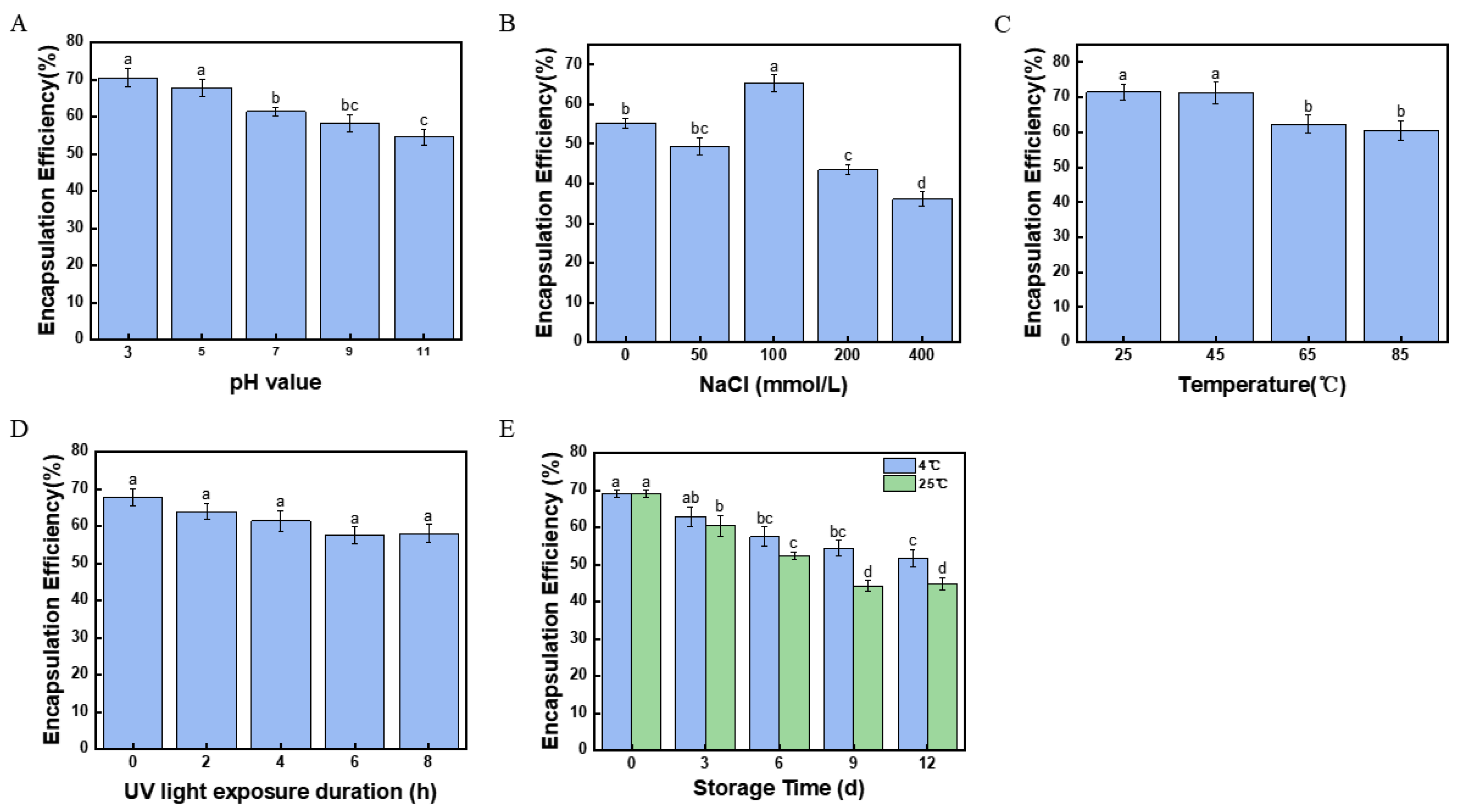 3.20. Encapsulation Efficiency of Fucoxanthin in the Pickering Emulsion with Different Processing and Storage Factors