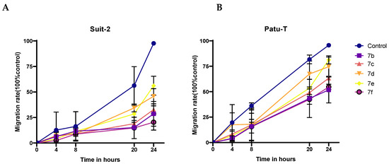 Compounds 7b–f, which demonstrated the most potent antiproliferative effects against the PDAC cell lines, were selected for further evaluation of their impact on cell migration using scratch wound healing assays in SUIT-2 and Patu-T cells.
