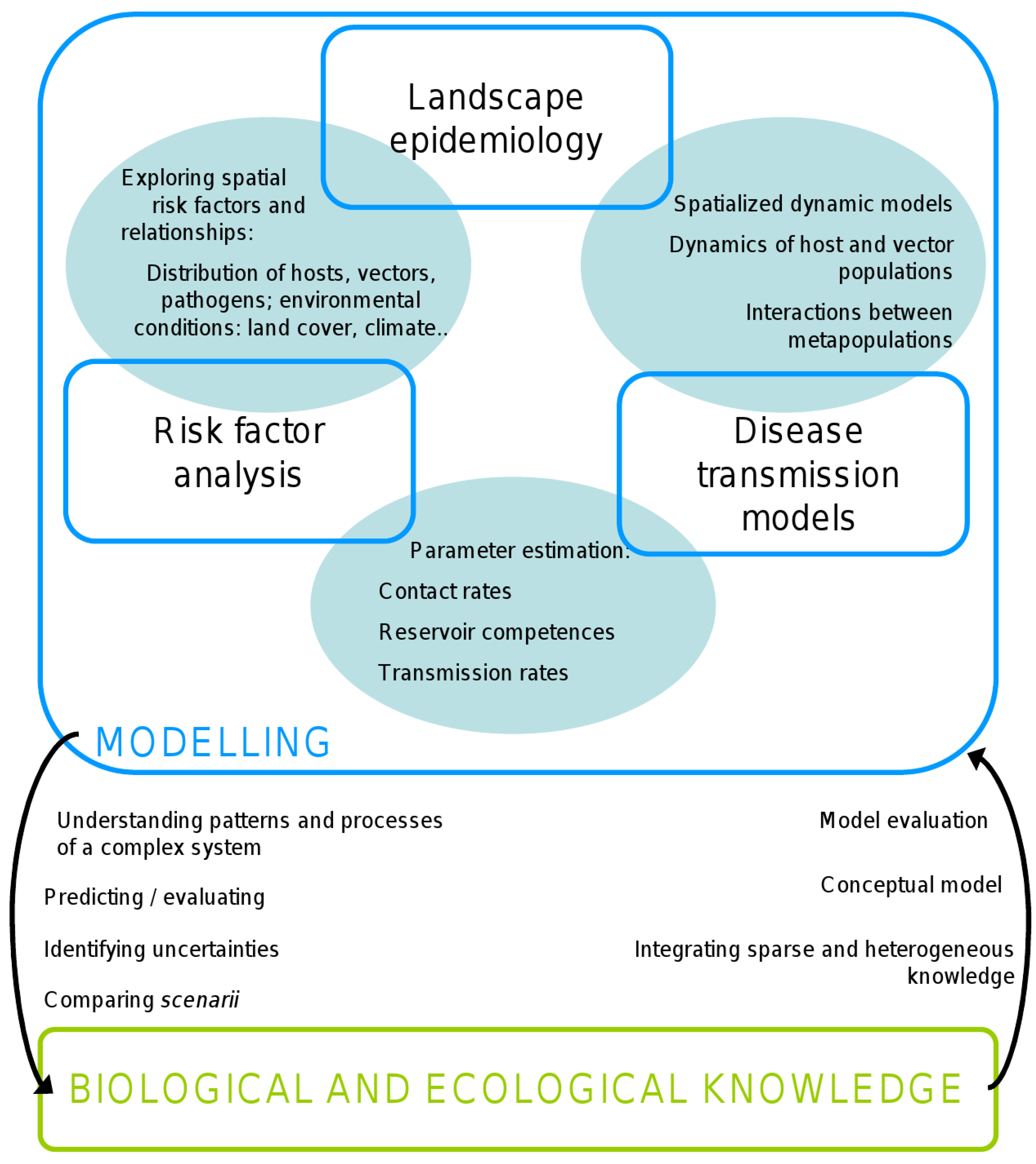The complementary contributions of risk factor analysis, landscape epidemiology and disease transmission modeling to the biological and ecological knowledge of epidemiologic systems, and the mutual input of modeling and biology.