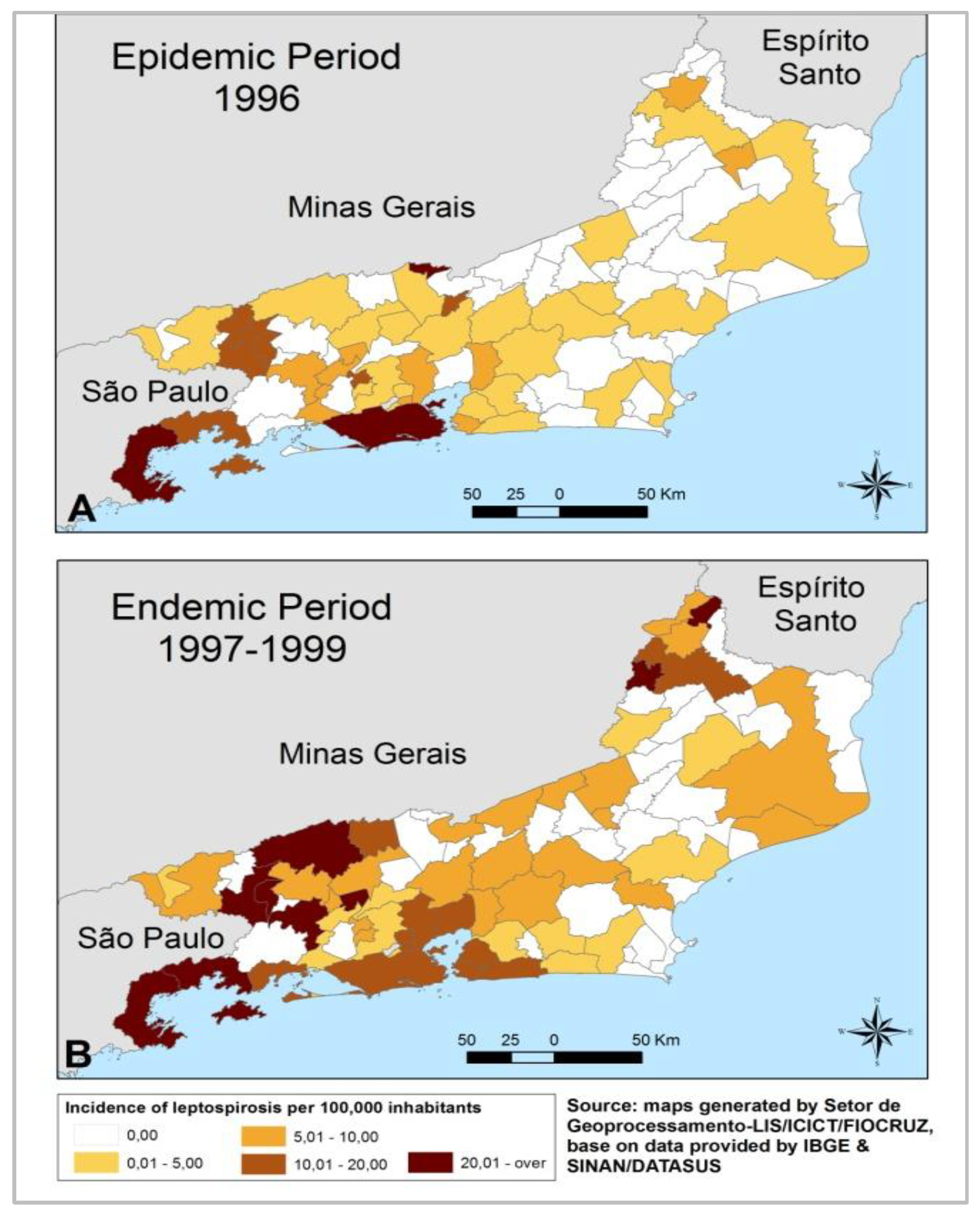 Leptospirosis incidence rates in the Rio de Janeiro state during epidemic and endemic periods are shown in Figure 1A,B respectively. We can observe the highest rates in the Rio de Janeiro and Parati municipalities during the epidemic period. While in the endemic period, the Parati rate remains high together with other municipalities of the northwestern region of the state in the Paraíba river valley (close to Minas Gerais state border). It should be noticed that total number of leptospirosis cases in Rio de Janeiro state in 1996 (epidemic period) was the highest in the last 20 years, even though the incidence rates were lower for most of the municipalities in the state. This paradox is explained by the extremely high number of cases in the municipality of Rio de Janeiro which concentrates a large portion of the state population.