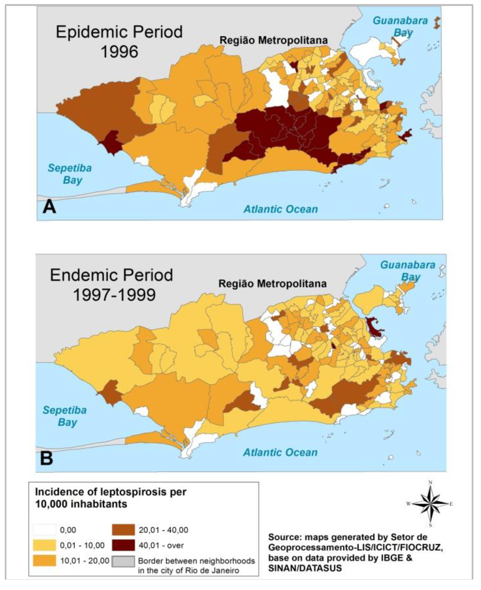 - Barcellos, C.; Sabroza, P. Socio-environmental determinants of the leptospirosis outbreak of 1996 in western Rio de Janeiro: A geographical appoach. Int. J. Health Res. 2000, 10, 301–313. [Google Scholar] [CrossRef]