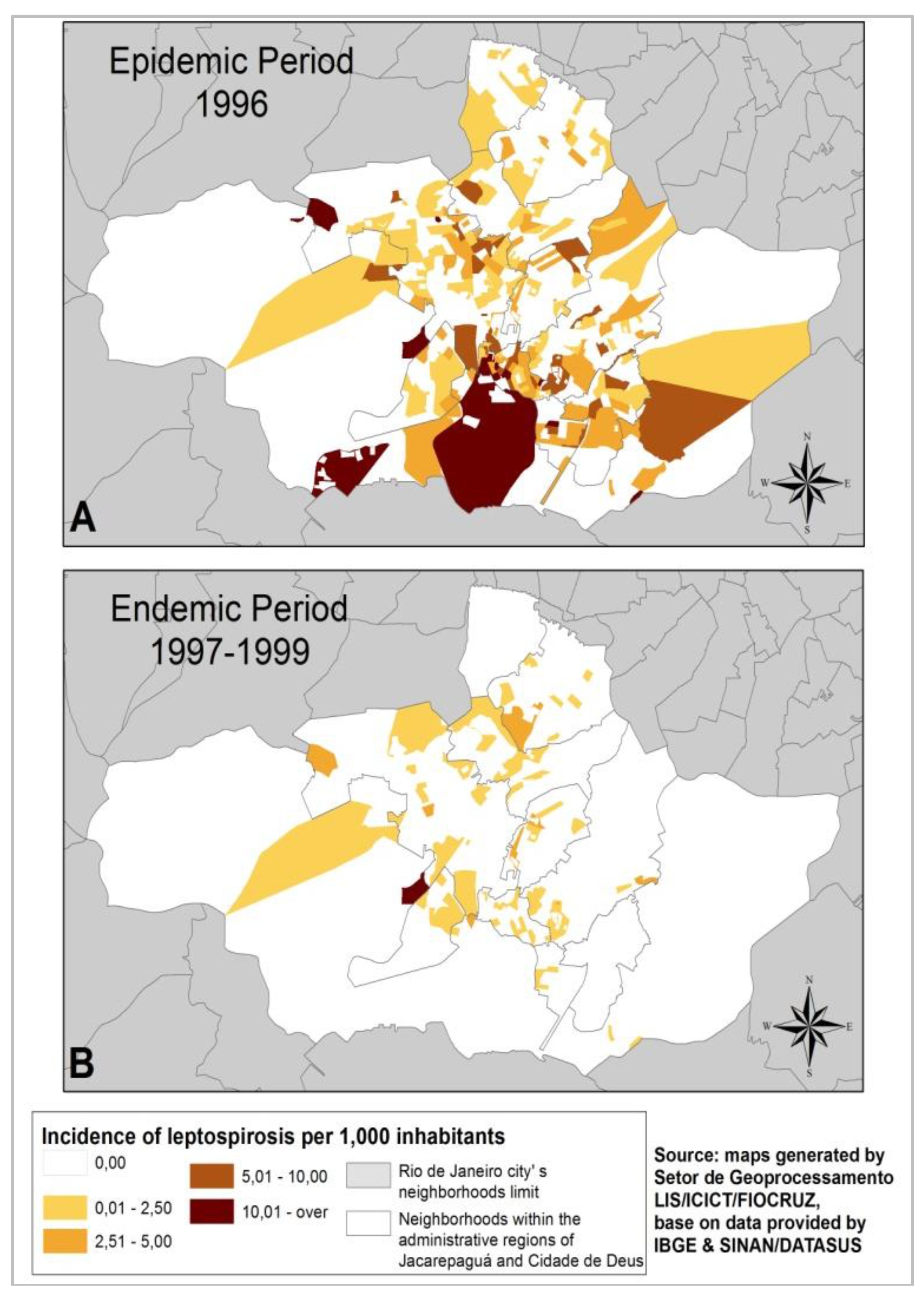 Leptospirosis incidence rates in the neighborhoods of Rio de Janeiro city during epidemic (A) and (B) endemic periods, respectively.