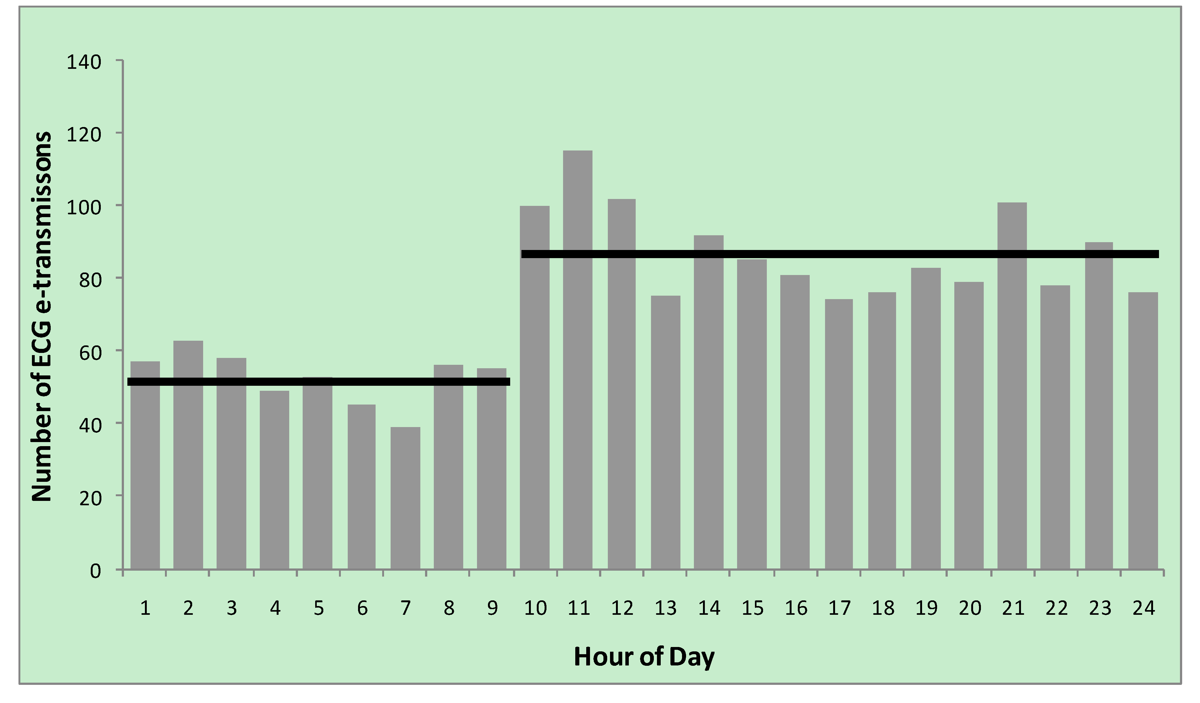 Diurnal variation in e-transmission of ECG; horizontal bars represent the mean number of transmissions for the hours spanned by the bar.