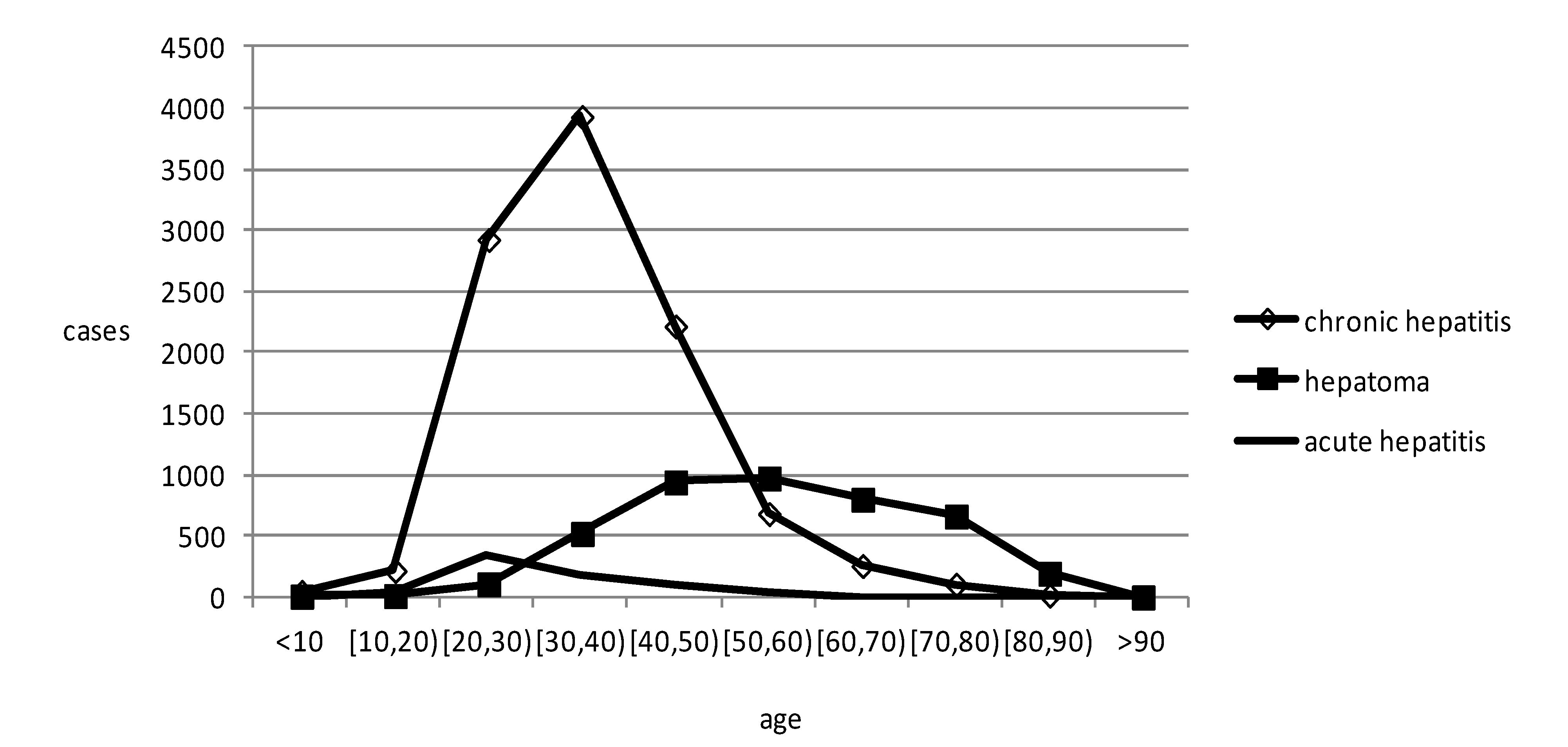 The age distribution of hepatitis B and hepatoma in Shenzhen from 2010 to 2012.